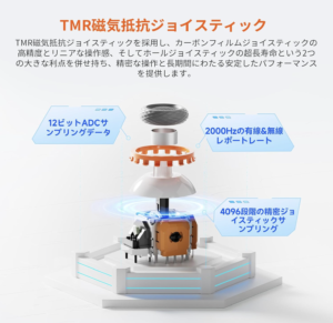 従来の「ホールエフェクトセンサー」が10bit(1,024段階)の解像度だったのに対し、このTMRセンサーは12bit(4,096段階)の解像度に対応しています。これにより、指先の極わずかな動きも正確にゲーム内へ伝わります。また、磁気抵抗方式のため物理的な摩耗がなく、スティックのドリフト現象とは無縁という圧倒的な耐久性も備えています。